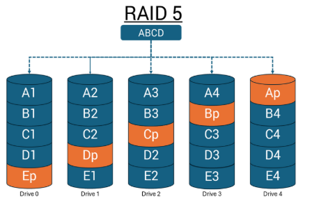 RAID 5 spreads data and parity (error-checking info) across at least three drives. If one drive fails, the system can rebuild the missing data using the parity.