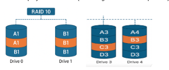RAID 10 (1 + 0) is a nested RAID configuration consisting of RAID 1 and RAID 0 in combination. RAID 10 takes mirrored RAID 1 arrays and then stripes them in RAID 0, resulting in high speed as well as high redundancy. You can also have RAID 01 (with the mirroring and striping reversed from RAID 10), however as it offers less fault tolerance with the same storage requirements, it is not recommended.